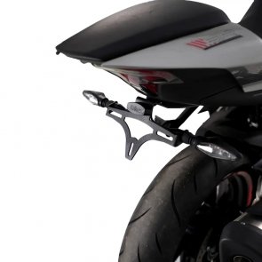 Akcesoryjny uchwyt tablicy rejestracyjnej R&G Fender Eliminator pozwala zrezygnować z fabrycznego, masywnego tylnego błotnika, co mocno poprawia wygląd maszyny. Uchwyt wykonany jest ze stali nierdzewnej i/lub aluminium i malowany proszkowo. Pozwala na zamontowanie tablicy rejestracyjnej blisko ogona motocykla, nadając mu lekką, minimalistyczną linię. W komplecie homologowane oświetlenie LED. Uchwyty R&G Fender Eliminator przeznaczone są do użytku w krajach, w których stosuje się małe tablice rejestracyjne – np. w Wielkiej Brytanii (18 cm wysokości). Dają możliwość montażu oryginalnych lub akcesoryjnych kierunkowskazów. Kolor: czarny.