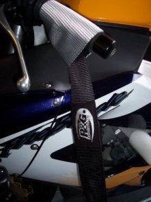 Rewolucyjny system mocowania „tie-down” pozwala na przypięcie motocykla do przyczepy lub podłogi busa i ściśnięcie widelca, bez ryzyka zarysowania górnych lag lub paneli owiewki. Górne pasy mają miękką wyściółkę, która przechodzi przez górną część widelca oraz prowadnice kierownicy, co umożliwia dopięcie pasów napinających z dala od motocykla. Dwie sztuki w zestawie. Kolor: czarno-srebrny z naszytym logo R&G. Zestaw nie zawiera pasów napinających!
