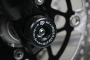 Slidery widelca R&G Fork Protectors w formie masywnych rolek montowanych na przedniej osi. Chronią widelec i przednie zaciski hamulcowe przed uszkodzeniami w czasie wywrotki i ślizgu. Wykonane z wytrzymałego tworzywa. Łatwe w montażu i estetyczne, nie psują wyglądu motocykla.