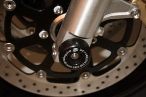 Slidery widelca R&G Fork Protectors w formie masywnych rolek montowanych na przedniej osi. Chronią widelec i przednie zaciski hamulcowe przed uszkodzeniami w czasie wywrotki i ślizgu. Wykonane z wytrzymałego tworzywa. Łatwe w montażu i estetyczne, nie psują wyglądu motocykla.