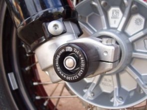 Slidery widelca R&G Fork Protectors w formie masywnych rolek montowanych na przedniej osi. Chronią widelec i przednie zaciski hamulcowe przed uszkodzeniami w czasie wywrotki i ślizgu. Wykonane z wytrzymałego tworzywa. Łatwe w montażu i estetyczne, nie psują wyglądu motocykla.